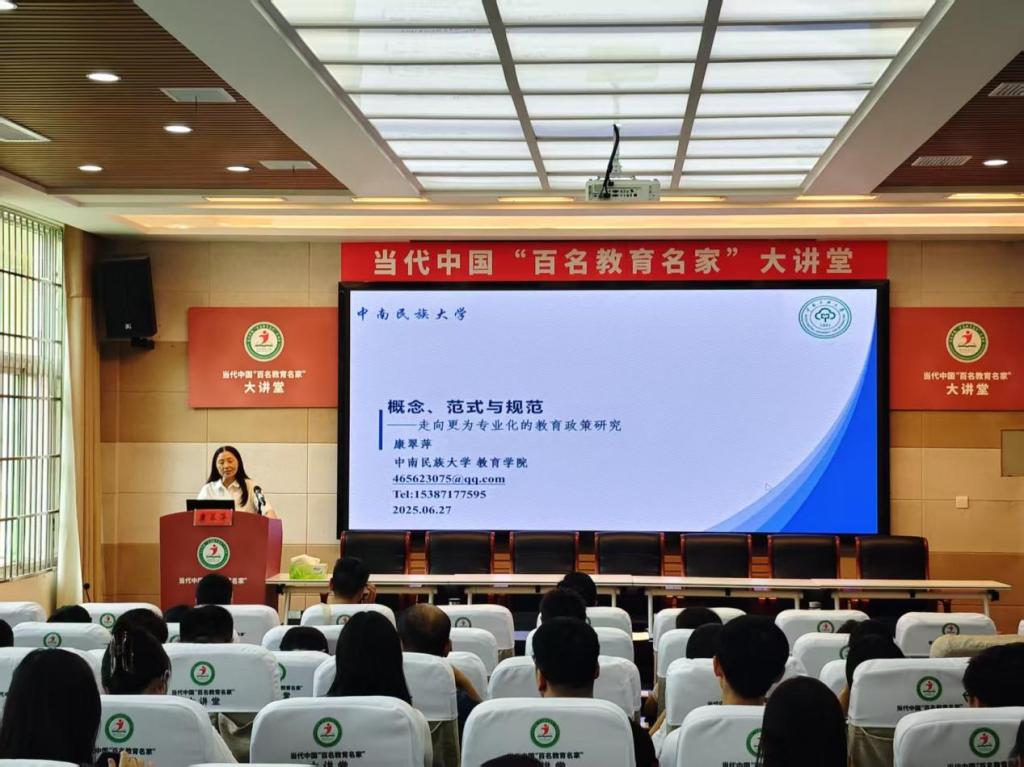 时间:2025-06-28 12:39:52 来源:太阳集团tyc539 作者: 阅读: 次2025年6月27日下午,中南民族大学学术委员会主任康翠萍教授,应邀做客太阳集团tyc539并作题为《概念、范式与规范—走向更为专业化的教育政策研究》学术专题报告。教育硕士导师、研究生及基础教育一线教师代表参加了报告会。