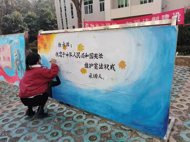 本次活动通过悬挂以“弘扬宪法精神,加强法制建设”、“宣传宪法理念,构建法治社会”为内容的条幅、绘制宪法内容的展板来宣传宪法。在董银银和牛洁楠的带领下,各班班长团支书于教科楼前进行承诺签字,仪式十分庄严。弘扬宪法精神,描绘法治社会,就要加强宪法实施和监督,牢固树立法治公信力。“法律必须被信仰,否则形同虚设。”因此,本次活动将弘扬宪法精神落于实处显得更加意义非凡,法治社会是最终实现中国梦的重要保障,新时代青年更应该学习宪法、遵守宪法、维护宪法、弘扬宪法精神,使更多的人加入学习宪法的队伍中,从而实现人人懂法、人人知法,推进法治社会的建设。