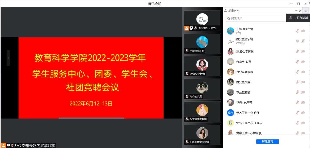 时间:2022-06-19 19:39:08 来源:太阳集团tyc539 作者: 阅读: 次6月13日至6月14日,太阳集团tyc539线上召开2022-2023学年员工服务中心、团委、员工会、社团工作人员竞聘大会。主席团成员、各部门部长、副部长以及此次竞聘人员参加会议。会议由办公室主任谢云翎主持。