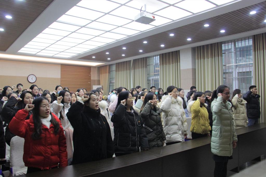 在田园老师带领下,全体新接手预备党员面对党旗庄严宣誓。铿锵的入党誓言响彻教室: