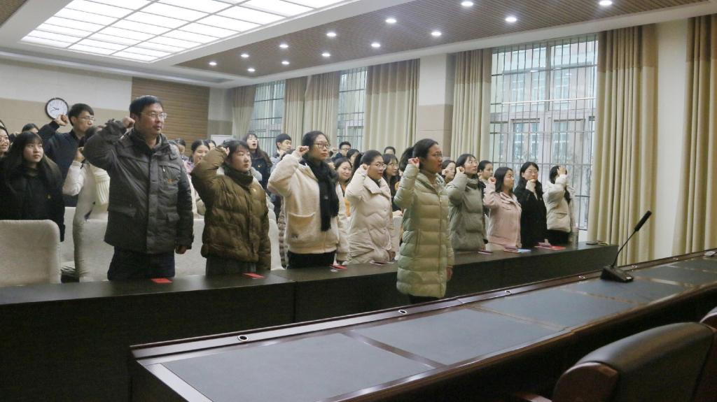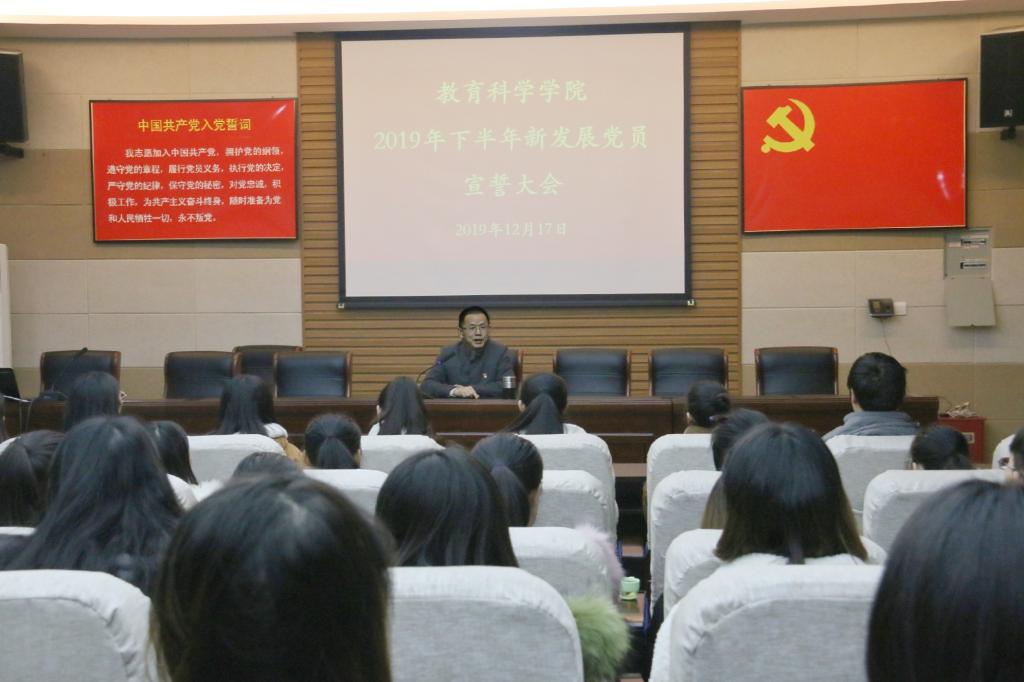 会上,张纪娥老师宣读了2019年下半年新发展党员名单,并为新党员佩戴党徽。接着,全体新党员们整齐站立,在领誓人田园老师的带领下,紧握右拳,面向党旗庄严宣誓。慷慨激昂的宣誓声铿锵有力,表达着对党的忠诚和为共产主义事业奋斗终身的决心。随后,李辉书记发表讲话,他对新党员们表示热烈的祝贺,并对新党员们提出了三点要求:一、加强党的理论学习,贯彻落实党规党章,提高自身政治素养;二、强化学习意识,不断丰富专业知识,树立专业作风,提升专业能力;三、充分发挥党员的先锋模范作用,严于律己,思想上做表率,学习上做标兵。最后,张纪娥老师作总结发言,她强调每一位党员应时刻牢记党员的责任和要求,遵守党的纪律,执行党的决定,做中国特色社会主义事业的合格建设者和接班人。