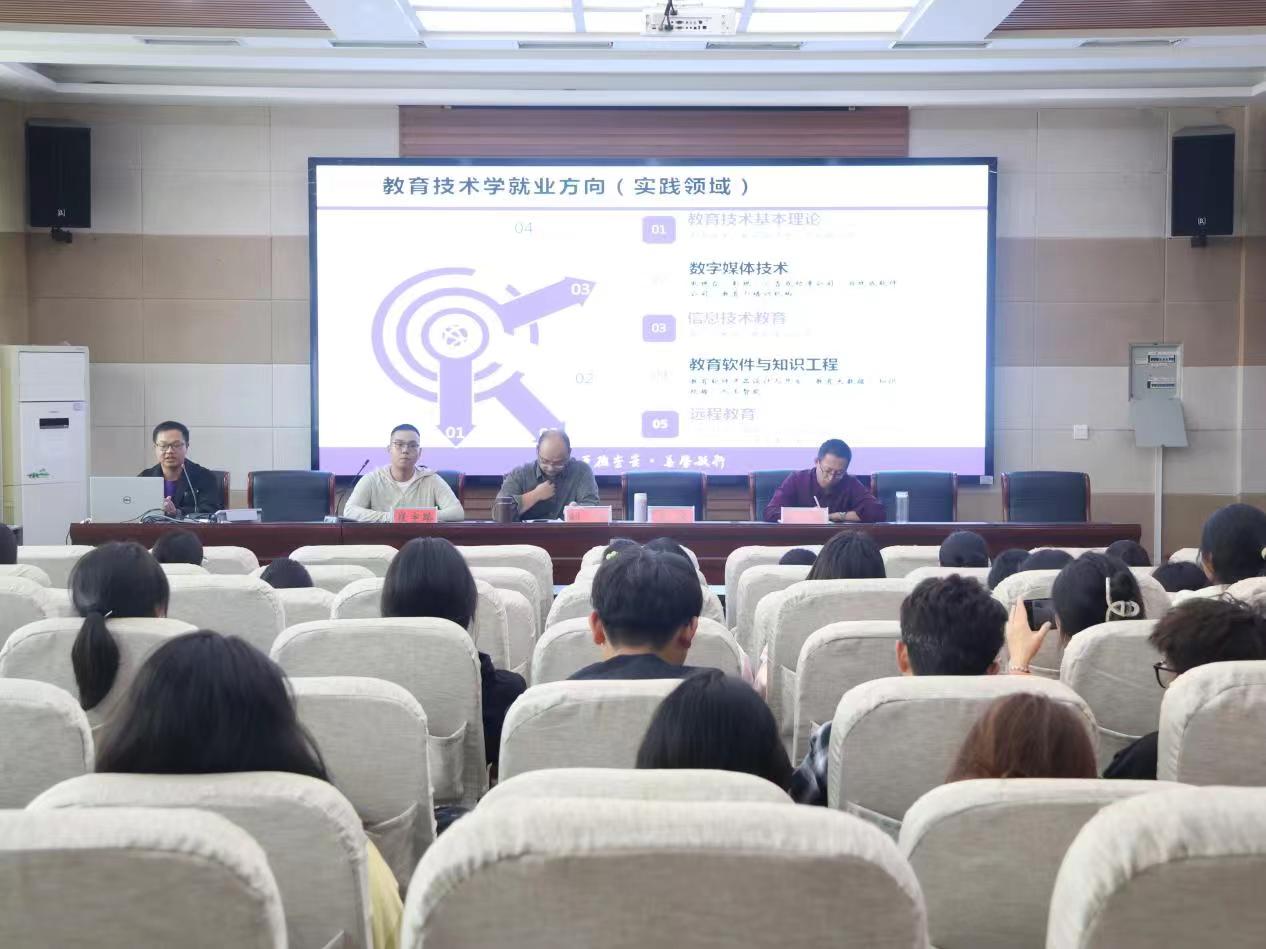 会议伊始,崔宇路分别就专业介绍和培养目标两方面进行汇报。在专业简介方面,他详细列举了专业核心课程和主要实践性教学环节,希望同学们对老员工活有初步的了解。接着,刘琦老师以教育技术专业的培养目标为中心,结合现实情况,表明国家政策指导发展方向,指出专业优势,坚定专业信念。随后武滨老师展示近年来教育技术学专业就业与考研数据来总结教育技术学就业方向,增添了同学们的专业自信心和认同感。最后张立春老师用就业择业感悟,强调了在大学四年的求学路上,一要做好学业,二要不断提升专业素养和综合能力、明确目标,不可碌碌无为。