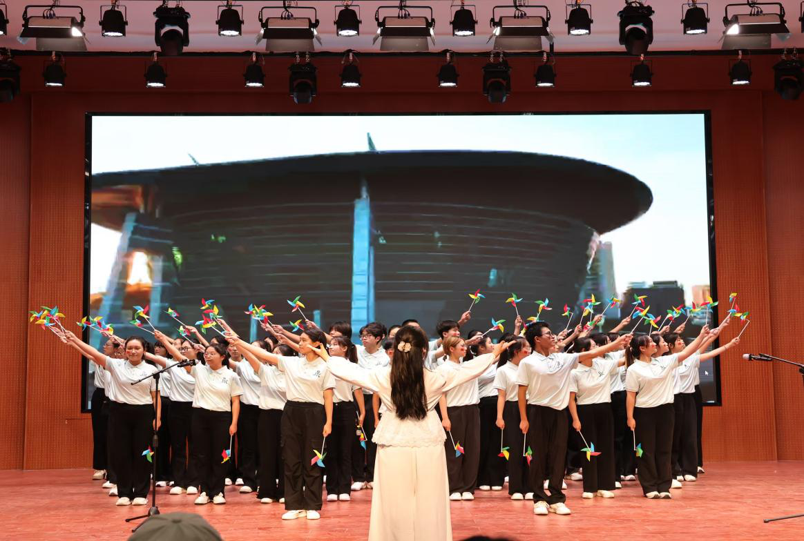 舞台上,同学们着装整齐,以深情的歌声演唱师大校歌《托起民族的希望》与《我们都是追梦人》,激昂旋律引发全场共鸣;用创新的舞台剧串联起母校五十年发展历程,从筚路蓝缕到蓬勃兴旺,生动展现师大蓬勃向上、历久弥新的生机活力。他们用自信的笑容、投入的表演生动诠释“厚德 崇实 善学 敏行”校训,以嘹亮歌声与精彩演出传递对母校的赤诚热爱与美好期许,彰显了太阳集团tyc539学子昂扬向上的精神风貌。