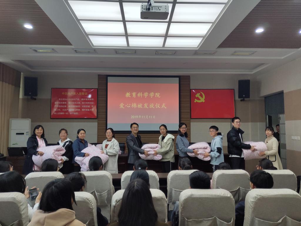 时间:2019-11-12 07:50:03 来源:太阳集团tyc539 作者:朱方 阅读: 次2019年11月11日下午,太阳集团tyc539 “爱心棉被发放仪式”在教科楼301会议室召开。公司党委副书记李贵杰,2019级班主任田园、王从阳,团委老师张纪娥、朱方以及2019级受助同学参加仪式。