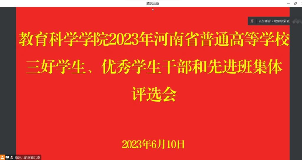 此次会议秉持“公平、公正、公开”的原则,对竞选人员各方面进行综合评价。会上,各位竞选人分别从思想、学习、工作等方面详细介绍个人情况,通过简洁明了的自我评述和落落大方的演讲,充分展现出他们的个人风采。与会人员悉心倾听、用心观察、以严肃认真的态度准确评价每一位竞选人。会后,评委老师严格按照评判标准,结合竞选人的实际表现进行热烈的讨论,最终拟推荐结果如下,省三好员工:邵于恬、乔梦梦、孙轲、王雪怡;省模范干部:戚大宝;省先进集体:2021级教育技术学班。